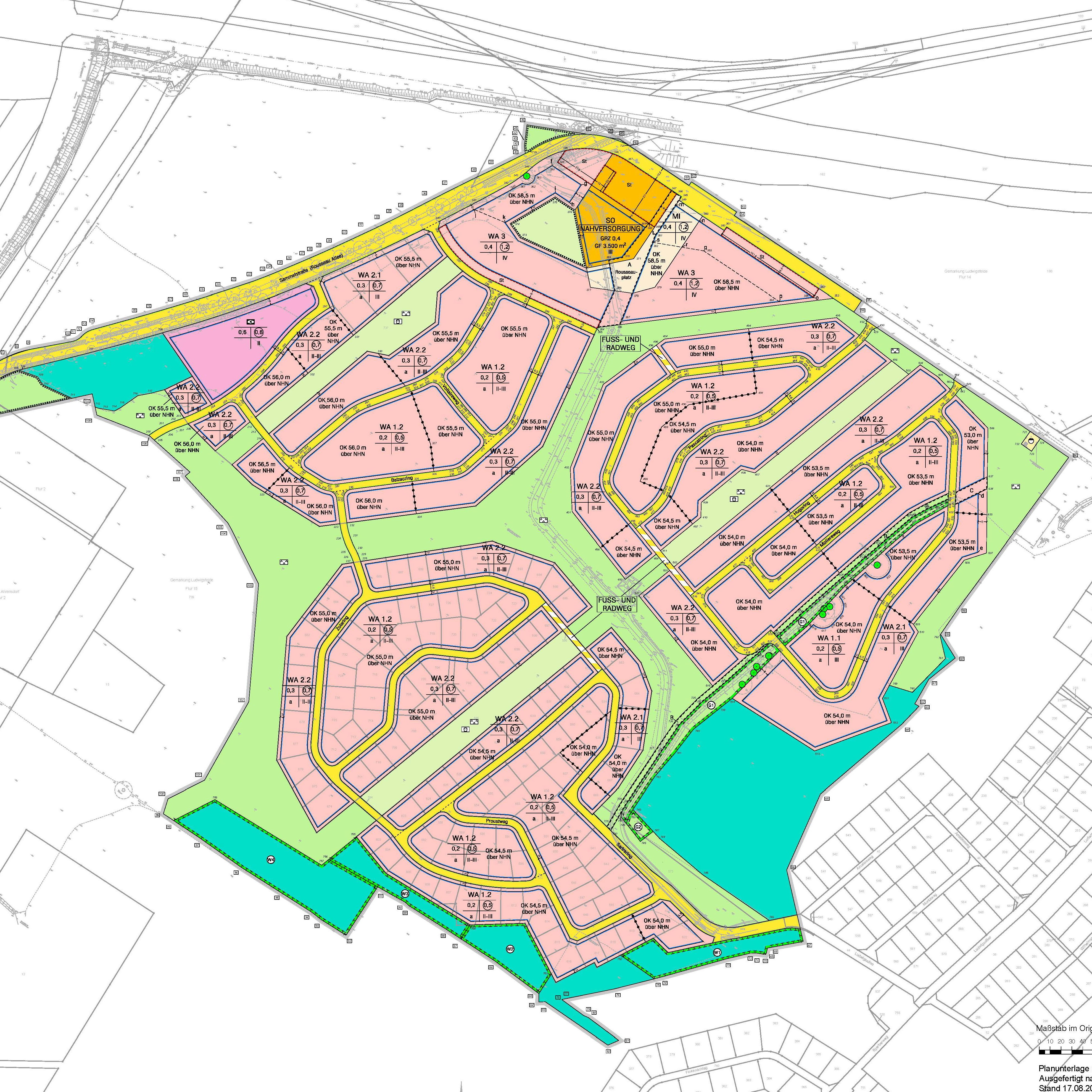 Vier Bebauungspläne für eine großflächige Stadterweiterung in einer expandierenden Umlandgemeinde. Umweltberichte und Ergänzungen des Landschaftsplans. Festsetzungen zum Umgang mit der Lärm- und Entwässerungsproblematik und zum Ausgleich von Eingriffen.