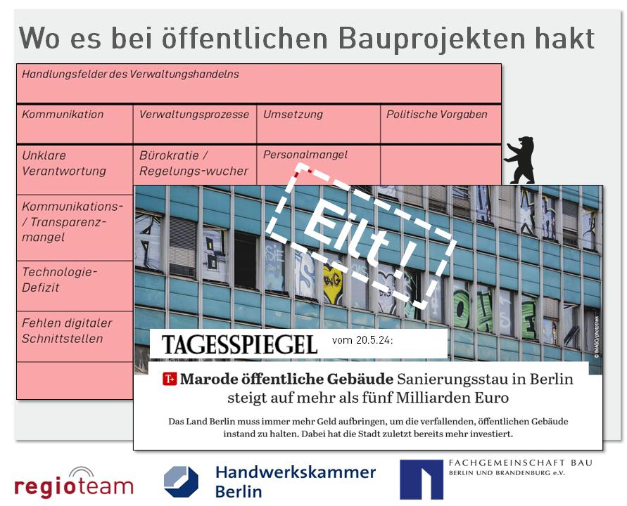 Die Entwicklungen der Berliner Wirtschaft im Allgemeinen und der Bauwirtschaft im Besonderen findet derzeit in einem schwierigen Umfeld statt: Die vor ein bis zwei Jahren noch ausgezeichnete Baukonjunktur leidet zunehmend unter den sich überlagernden Krisen von Corona, Ukraine-Konflikt und Lieferketten sowie Rohstoffengpässen, die auch eine hohe Inflation mit deutlich steigenden Einkaufspreisen für Baustoffe mit sich bringen. Hinzu kommt der stetig zunehmende Arbeits- und Fachkräftemangel, der auch in den öffentlichen Verwaltungen deutlich feststellbar ist und mit langen Bearbeitungszeiten auch die Bauwirtschaft negativ beeinflusst. Am Beispiel der Berliner Schulbauinitiative werden die Auswirkungen des Verwaltungshandeln aufgearbeitet. Neuauflage einer Studie aus dem Jahr 2015 im Auftrag der Handwerkskammer und Fachgemeinschaft Bau Berlin-Brandenburg.